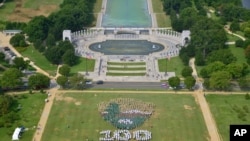 星期四早些时候,数百名志愿者汇集在国家大草坪,手中拿着棕色、绿色和白色的雨伞,为一场航拍摆出了美国国家公园的徽标图案。